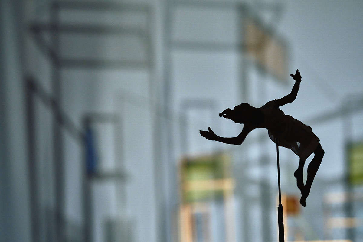 Een kleurrijke sculptuur, opgebouwd uit houten constructies en roostertjes vormen de bouwsels van een stad. Delen draaien rond en in elkaar. Bewegende lampjes maken schaduwbeelden zichtbaar tegen de muren. Geluid neemt ons mee naar de binnen en buitenruimtes. De tocht houdt halt in een kamer.