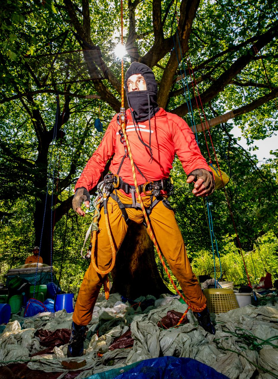 Hij weet niet meer precies hoe lang hij er al zit. Wel weet hij nog dondersgoed waarom. Ook al is de rest allang vertrokken. Hij is hier nodig. Hij moet dit doen. De volhardende activist die als enige overbleef in een poging om het bos om hem heen te redden. Toch waait het hard als je niet meer uit de wind gehouden wordt.